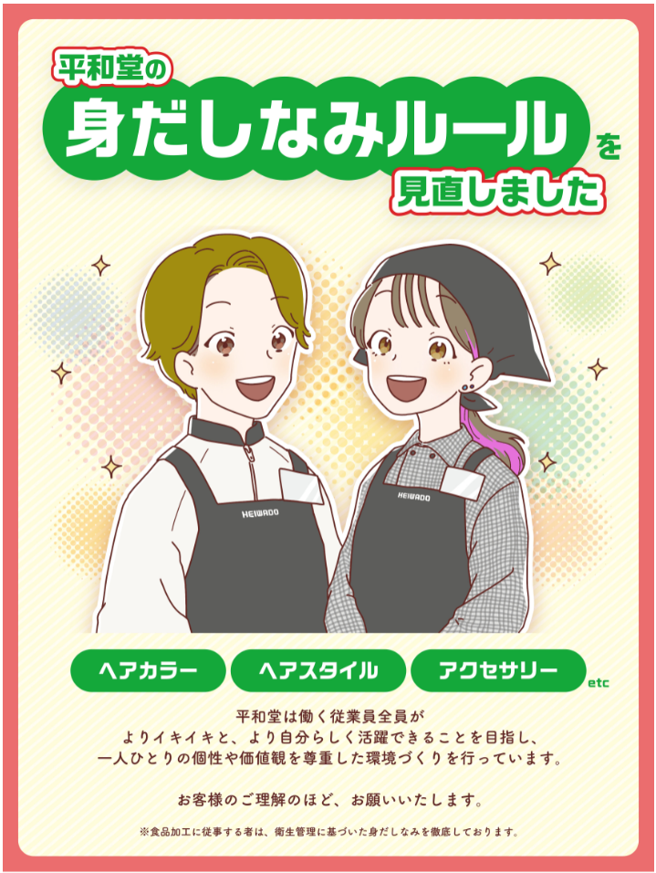 株式会社平和堂(滋賀県彦根市、代表取締役社長執行役員CEO:平松正嗣)は、従業員一人ひとりの多様性や個性、価値観を尊重し、より自分らしく意欲的に働ける職場づくりの一環として、10月1日(火)より、従業員の身だしなみルールを見直します。