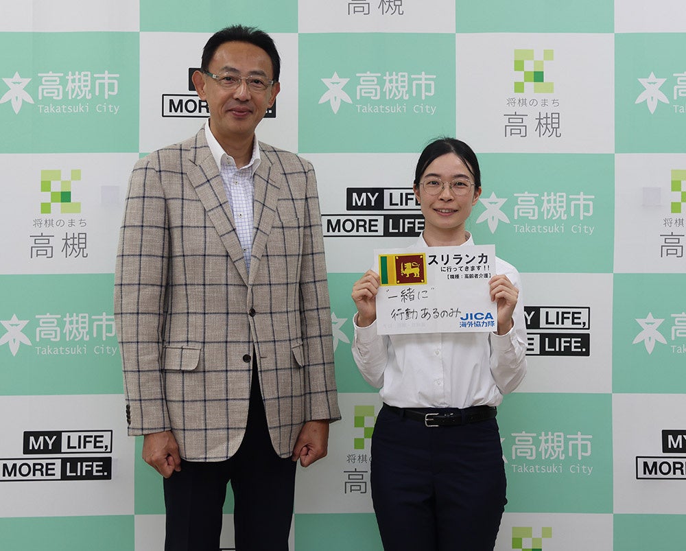 高槻市内の介護施設で介護福祉士として従事していた栗田さんは、「住み慣れた環境とは異なる地に長期滞在しながら様々な価値観に触れるとともに、これまでの経験を現地の方々に伝えていきたい」という想いから、同協力隊への参加を志望。令和6年8月から令和8年8月までJICA海外協力隊としてスリランカのクルネーガラへの派遣が決定しました。現地では、老人会や高齢者施設での体操の指導やレクリエーションの実施、高齢者に対する健康指導のほか、同僚・施設スタッフへの技術指導、高齢者や関係機関への講習会・ワークショップの実施を通して健康に関する啓発活動などを行う予定。この日、市役所を訪問した栗田さんは「自ら行動しスリランカの文化に染まりながら、現地の方と一緒に活動をしていきたいです」と派遣への意気込みを話し、濱田市長は「ぜひ、高槻市のますます元気体操やもてもて筋力アップ体操を広めて、現地の方々の健康づくりに役立てていただければと思います。身体に気をつけて頑張ってください」と激励しました。