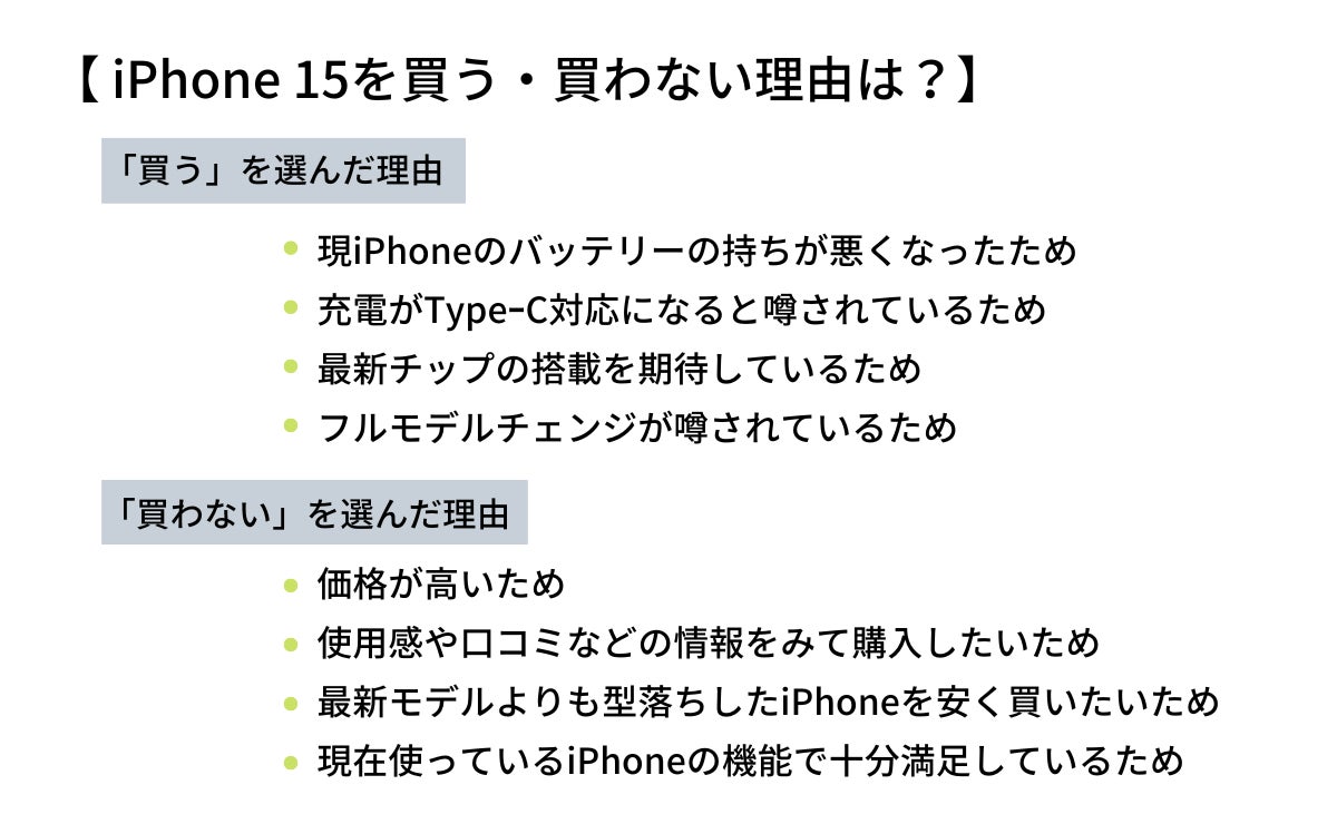 iPhone 15は71.7%が“買わない”と回答!理由は「価格が高いから」や、「型落ちしたモデルを安く買いたい」など【iPhone 15の購買意欲調査】