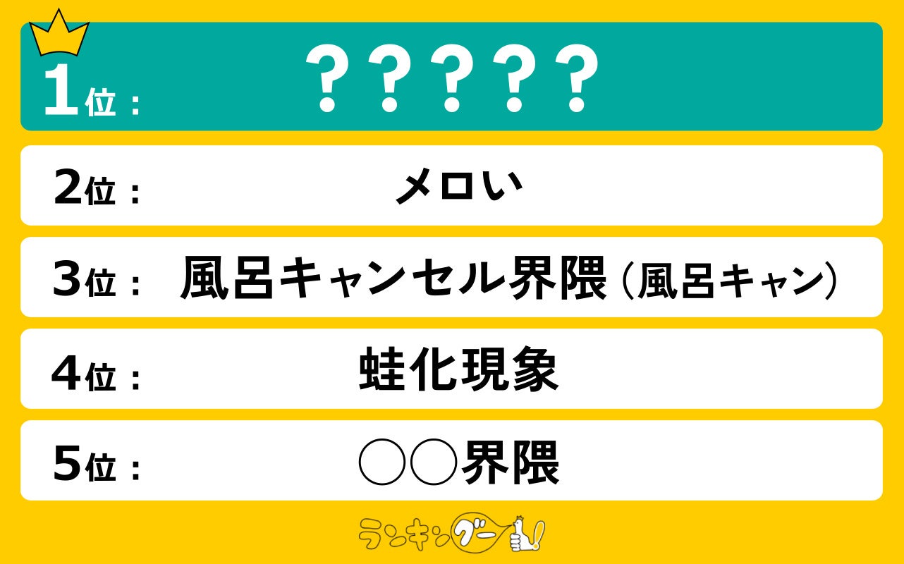 1位~5位まで僅差で順位が決定しました。1位はモデル・ゆうちゃみさんが発案し、「キャパオーバー」を略した言葉の「キャパい」。2位は「メロメロになるほどかっこいい、かわいい」という意味の「メロい」。3位はお風呂に入るのをやめる(お風呂をキャンセルする)ことを意味する「風呂キャンセル界隈(風呂キャン)」。4位は好意を抱いている相手のささいな言動が気になり、気持ちが冷めてしまうことを意味する「蛙化現象」。そして、5位は、特定の趣味や関心を共有する人たちを指す若者言葉の「◯◯界隈」がランクインしました!