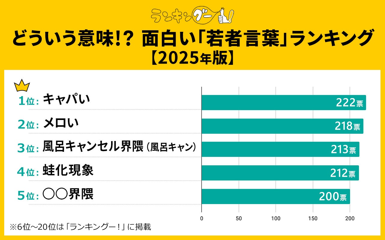 株式会社CMサイト(本社:大阪府大阪市、代表取締役社長:柴原 誠治)が企画編集する、「ちょっと気になる」を調べたランキングサイト『ランキングー!(https://rankingoo.net/)』は、『どういう意味!? 面白い「若者言葉」ランキング【2025年版】』の結果を、投票者のコメント付きで紹介する記事として公開しました。