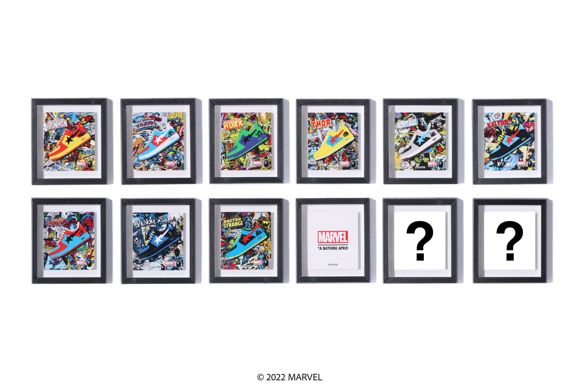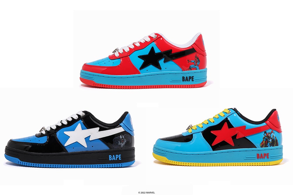 今回のコラボレーションでは、過去に「MARVEL」とのコラボレーションでもリリースされてきた「BAPE STA™」から、各キャラクターのカラーリングを落とし込んだマニア垂涎の一足が登場。注目すべきは、従来のシューボックスではなく、フィギュアと同様の “ブリスターケース”のパッケージであること。さらに、ヒールの両サイドにはそれぞれキャラクターと「MARVEL」ロゴの刺繍があしらわれています。また、ブリスターの台紙と同様のコミックアートがプリントされたインソールや、「MARVEL」の文字が刻印されたシューチャームなど、細部にまでこだわりの詰まった一足に仕上げました。