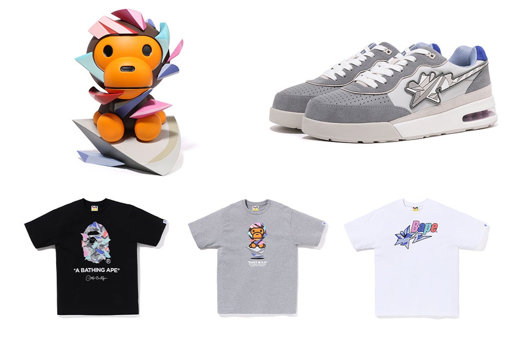 今回のコラボレーションでは、アパレル、グッズ、フットウェアを発売。BAPE®︎のシグネチャーであるBAPE®︎ CAMO、APE HEAD、BAPE STA LOGO、BABY MILO®︎などに彼の代名詞であるカラーリング、幾何学的な抽象画のスタイルをアクセントとして加えています。