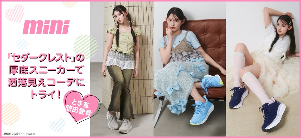 株式会社チヨダ(東京都杉並区 代表取締役社長 町野 雅俊)は、全国のシュープラザ、東京靴流通センター、公式オンラインショップなどで、当社プライベートブランド「CEDAR CREST(セダークレスト)」の厚底スニーカー「Cirrus(シーラス)」を展開しています。宝島社発行の人気ファッションWEBマガジン「mini WEB」では、“令和一可愛いアイドル”として注目を集める超ときめき♡宣伝部の菅田愛貴さんが、多彩なテイストで履きこなしてくれています。