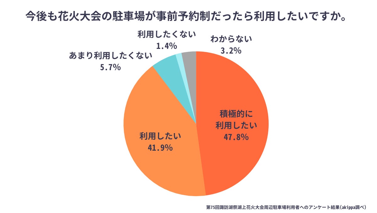 しかしながら、今後も花火大会の駐車場が事前予約制だったら利用したいか聞いたところ、「積極的に利用したい(47.8%)」「利用したい(41.9%)」と89.7%の方が利用意向があることがわかりました。