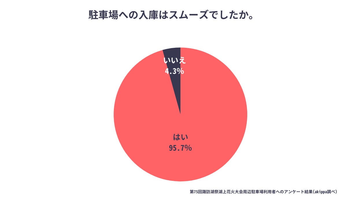 駐車場への入庫は、95.7%が入庫がスムーズだったと回答しました。その理由を聞いてみると「係員の方がスムーズに誘導してくれた」「噂のような渋滞もなかった」などが挙げられていました。