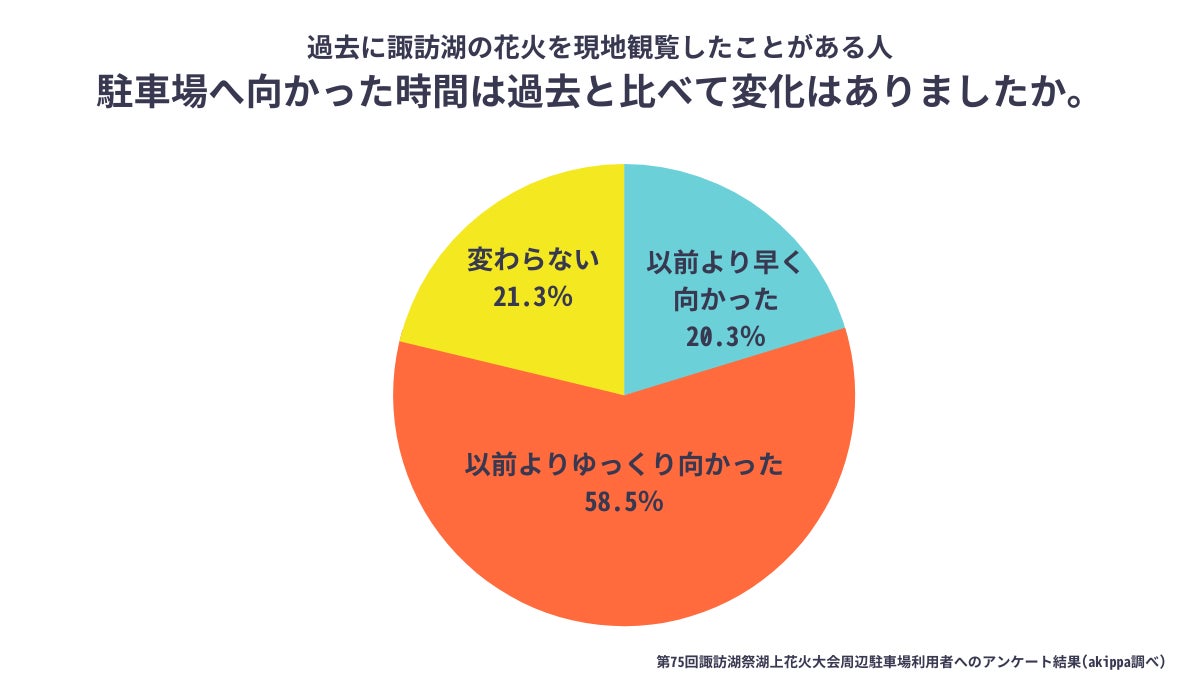 過去に諏訪湖の花火大会を現地で見たことがある人に対して、駐車場へ向かった時間の変化を聞いたところ半数以上の58.5%が「以前よりゆっくり向かった」と回答しました。「駐車場を確保するために早く行かなければならない」という状況は回避できたのではないかと推察されます。
