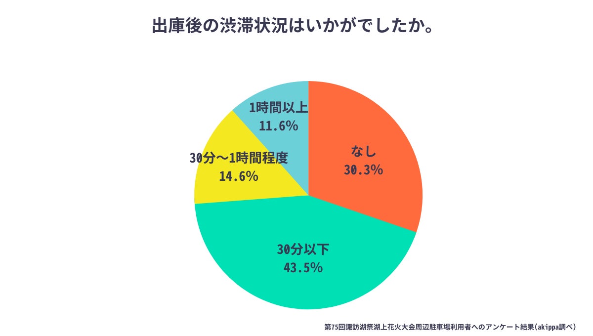 一方で、出庫後の渋滞については「30分以下(43.5%)」が「なし(30.3%)」を上回る結果となり、依然として課題が残る結果となりました。たとえば周辺駐車場を開拓する際に駐車場のエリアを分散させる、帰宅時間を分散させるなど改善を検討していきたいと考えています。