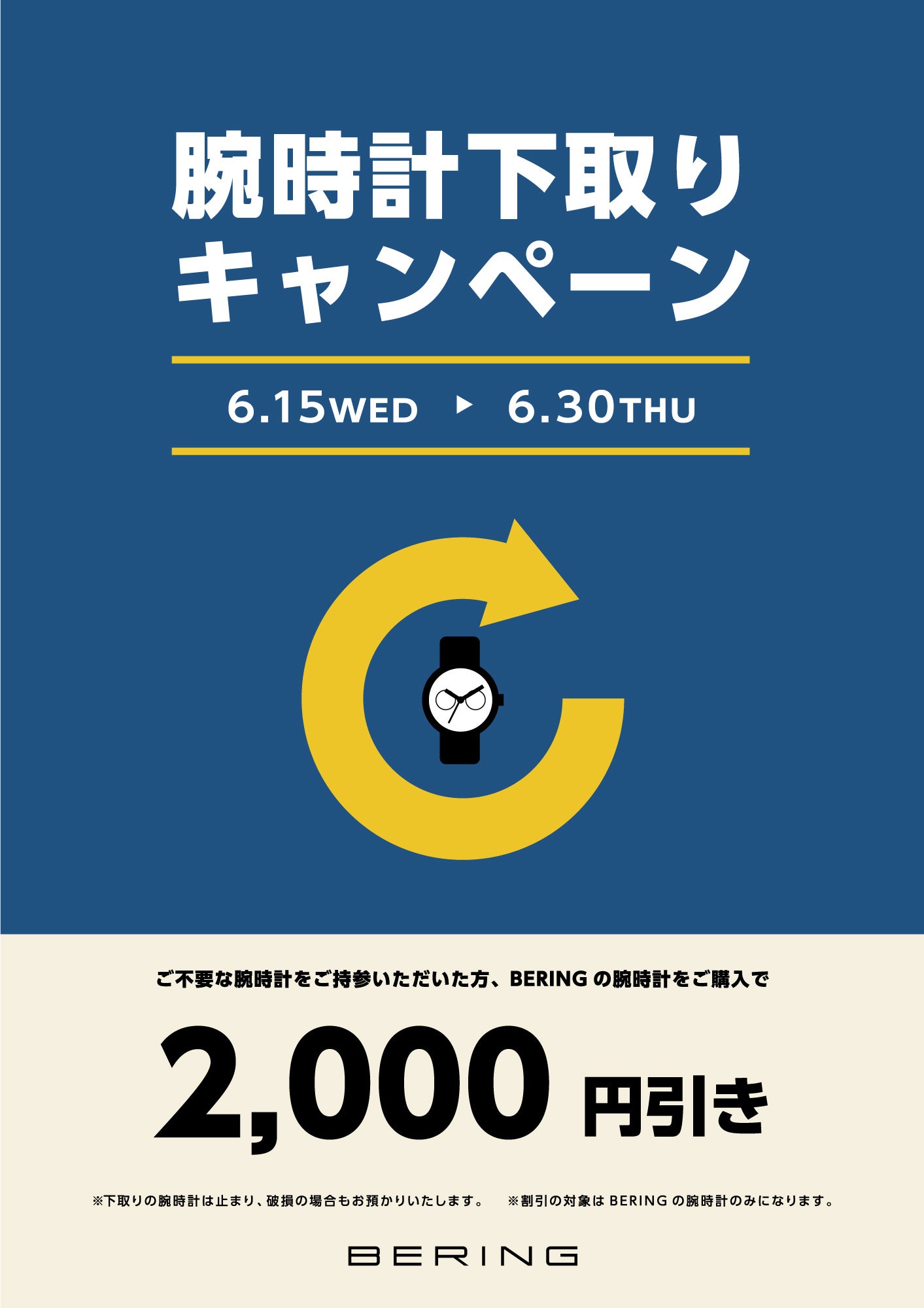 ■内容:期間中、不要になった時計を対象店舗にお持ち込み頂いた方は、BERINGウォッチを2,000円オフでご購入いただけます。