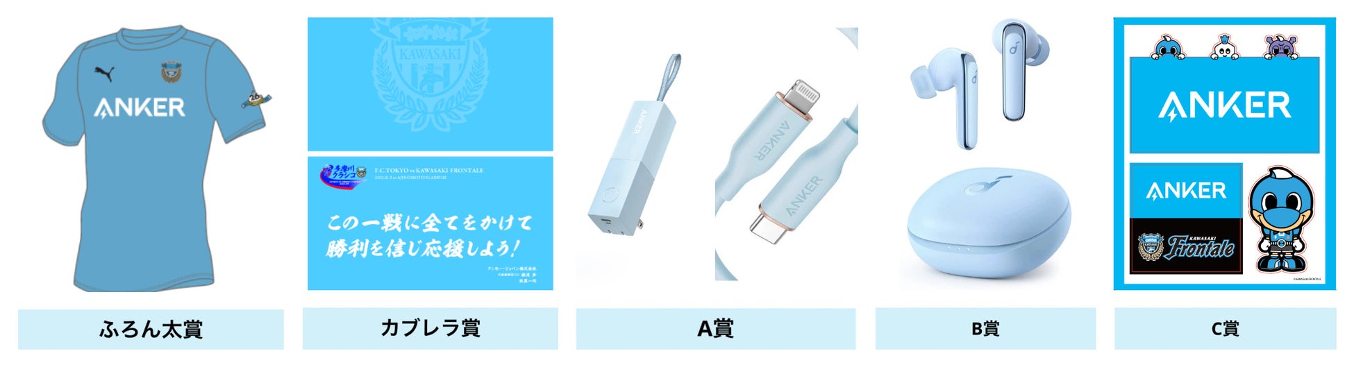 | 賞品 | 【ふろん太賞】Anker & Frontale オリジナルTシャツ(2名様) 【カブレラ賞】選手サイン入り多摩川クラシコオリジナル応援シート(5名様) 【A賞】Anker 511 Power Bank(PowerCore Fusion 5000)& Anker PowerLine III Flow USB-C &ライトニング ケーブル 0.9m セット(2名様) 【B賞】Soundcore Life P3(2名様)【C賞】オリジナル限定ステッカー(100名様) |