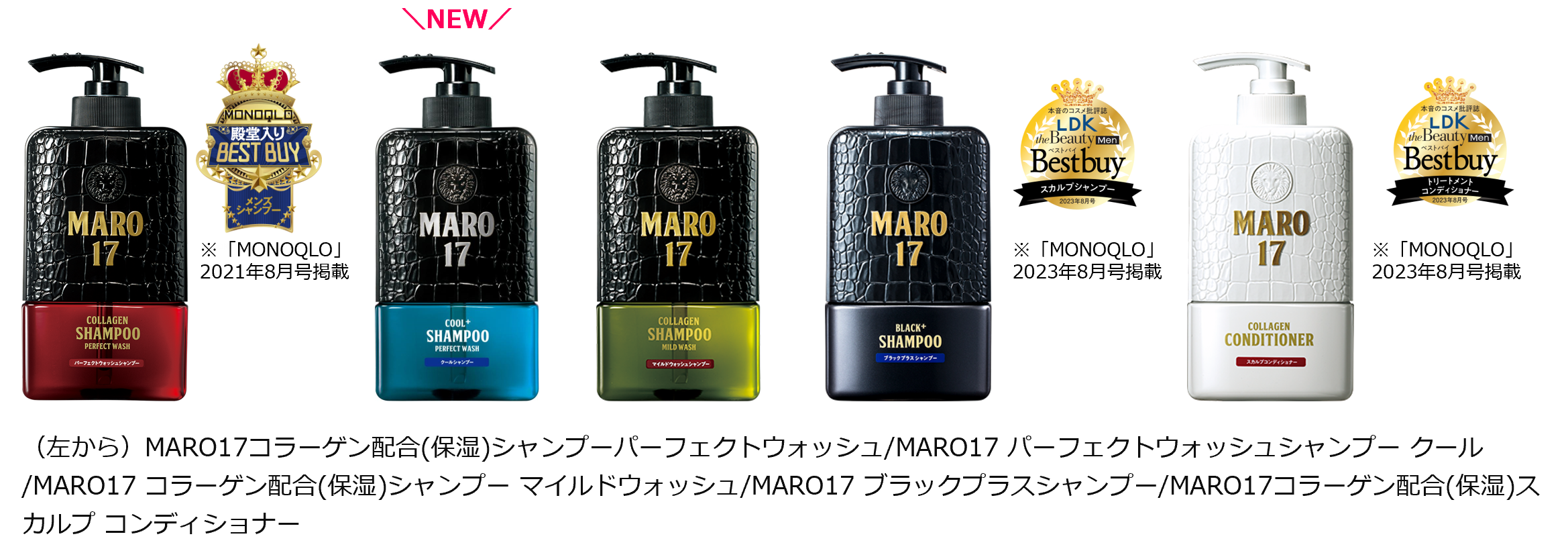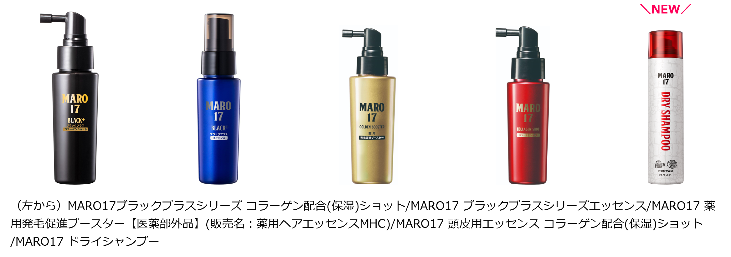 MARO17独自処方のペプチド(保湿)を配合したシャンプー、コンディショナー、ドライシャンプー、頭皮用エッセンスや薄毛・抜毛予防の薬用発毛促進ブースター【医薬部外品】(販売名:薬用ヘアエッセンスMHC)などをラインナップに取り揃えています。