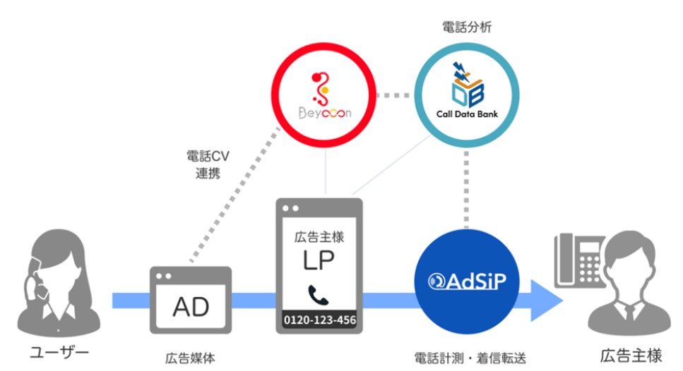 今回、広告計測ツール「Beyocon」に「AdSiP」が所有する効果計測用の電話番号と「Call Data Bank」が保有する通話ログを統合することで、電話によるコンバージョン地点を”成約数”として計測することができるようになりました。これにより、広告担当者は、申込フォーム経由と電話経由によるコンバージョン(=成約)件数を一括管理でき、包括的かつ正確な広告効果測定と分析が可能となります。