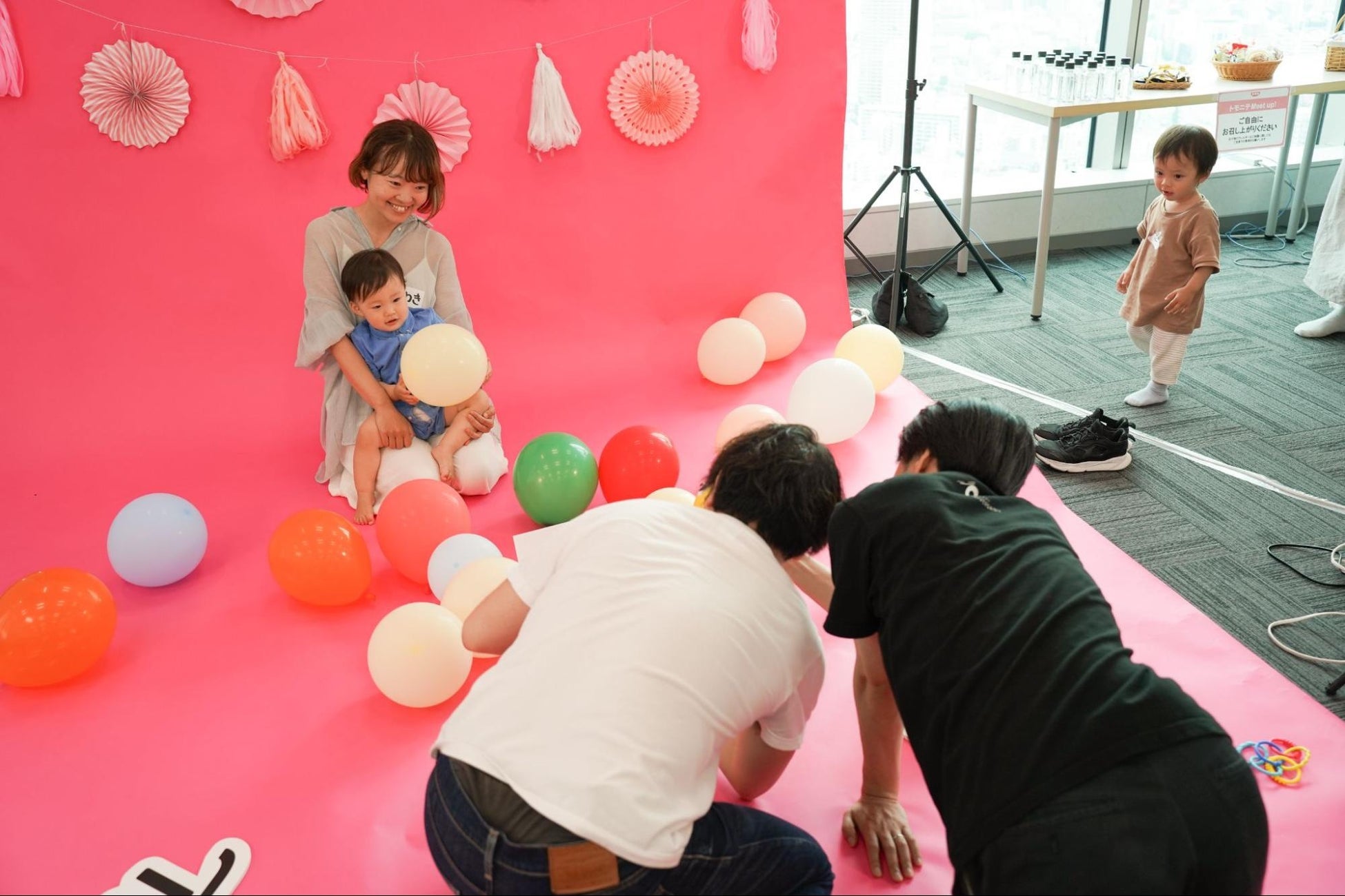 合間には、自由な休憩タイムが設けられました。会場に設置されたフォトブースにて、お子さんとのツーショットや家族写真を撮っている姿がみられました。また月齢が近い赤ちゃん同士が床に広げられたおもちゃで無邪気に遊んだり、ママたちが情報交換をしたりと、オフラインならではのあたたかい交流の場となりました。