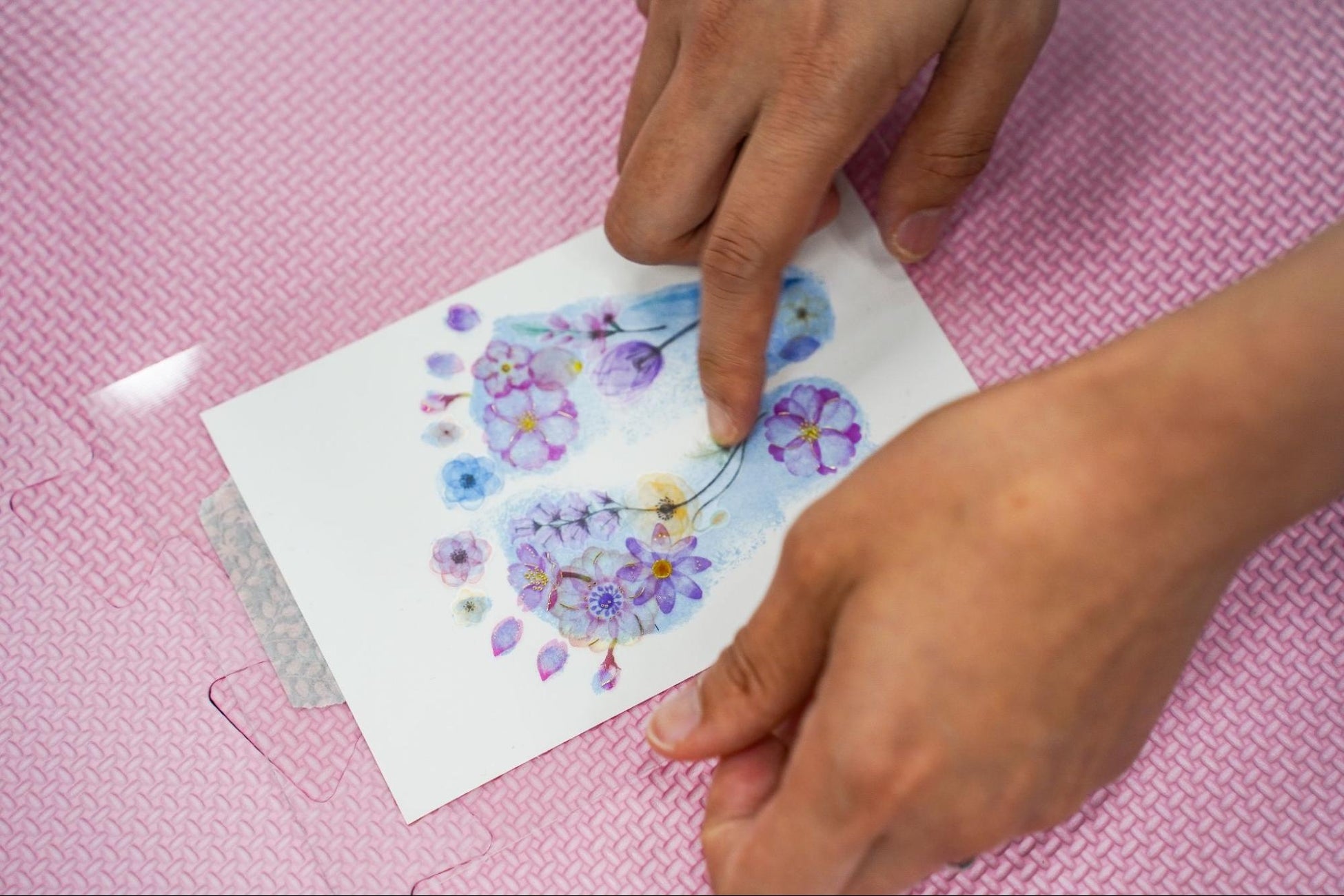 イベント後半は、『トモニテ』のSNSコンテンツの中でも特に大ヒットだった「お花の手形足形アート作り」のワークショップを実施。参加されたお子さんの手形や足形を、お花のシールで彩るアートは、会場でも大盛況でした。