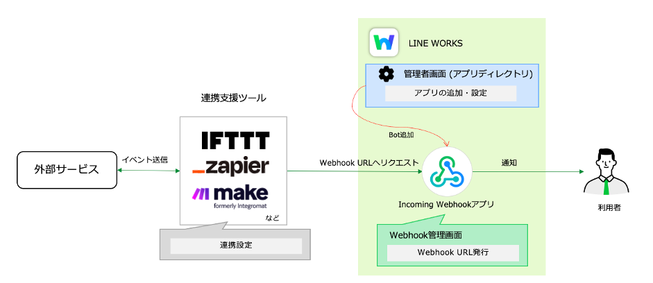 本アプリは、Webhookの中でもIncoming Webhook機能を提供しており、外部のサービスからLINE WORKSへの情報を自動的に受け取ることができます。