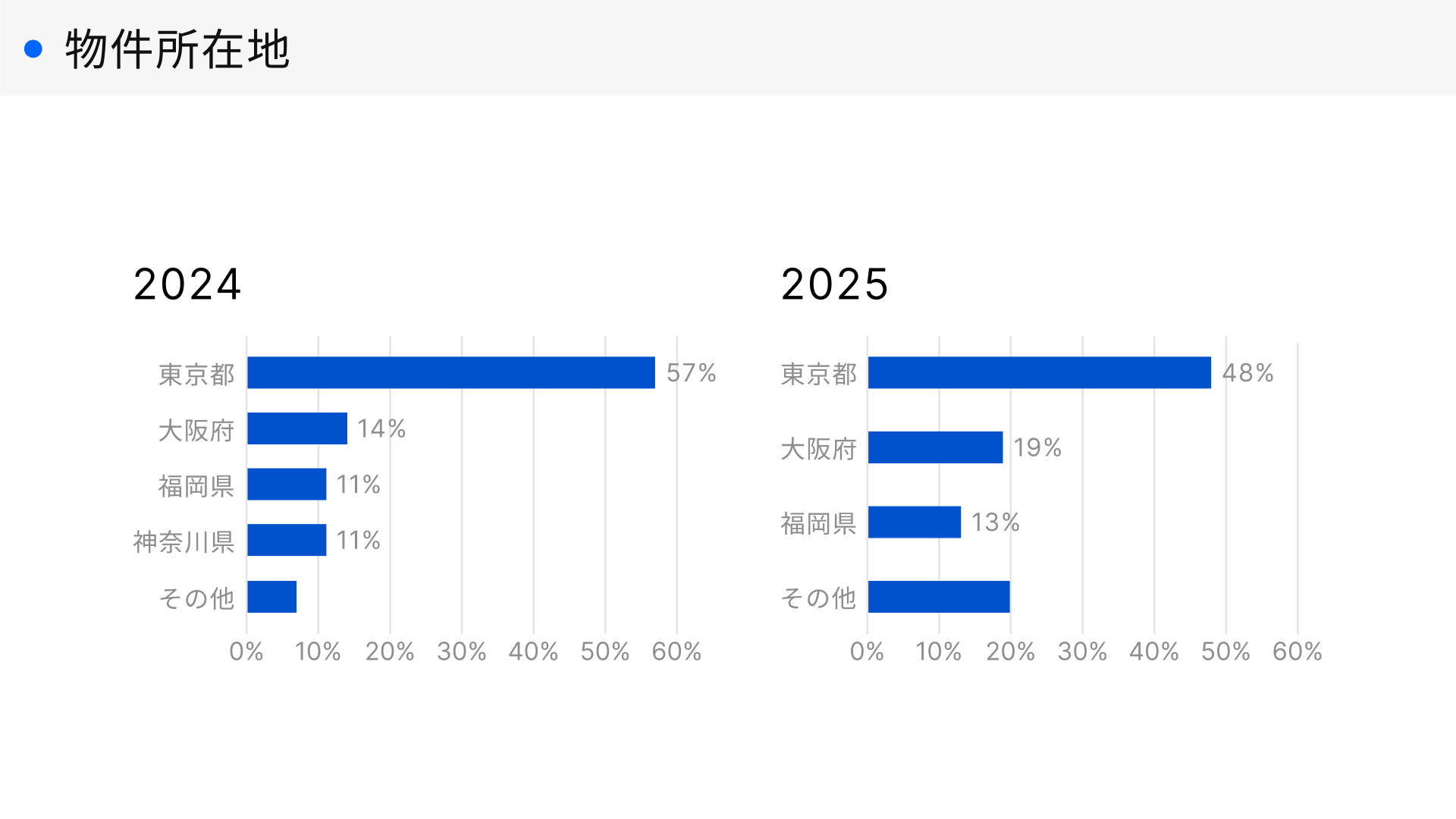 2025年における成約した物件所在地のボリュームゾーンは東京都の48%でした。2024年と比較すると、大阪府が5pt(2024年:14%、2025年:19%)増加しました。2025年に大阪市では、世界的なイベントや大規模な再開発が実施されました。このことにより、大阪府全体の盛り上がりを見越して不動産投資の物件を購入された方が増えたことが読み取れます。