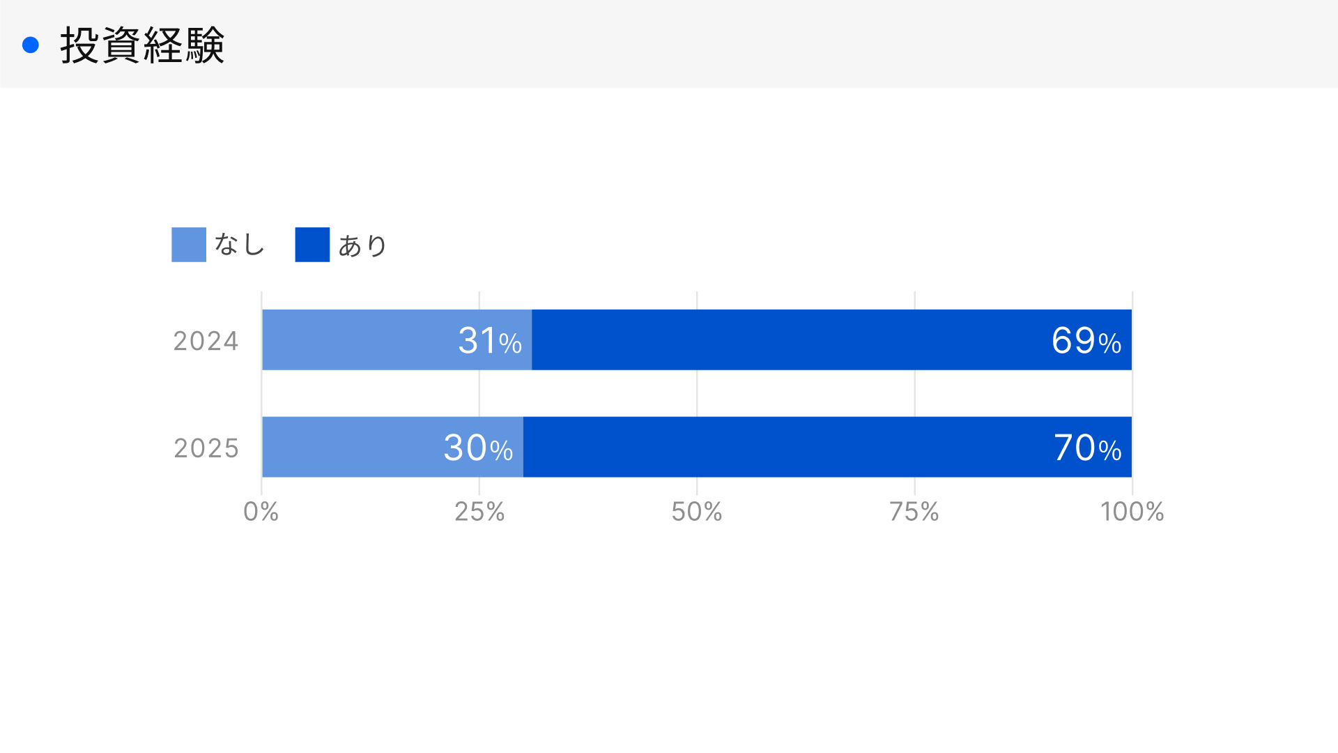 投資経験は「あり」が70%と高い水準が続く。
