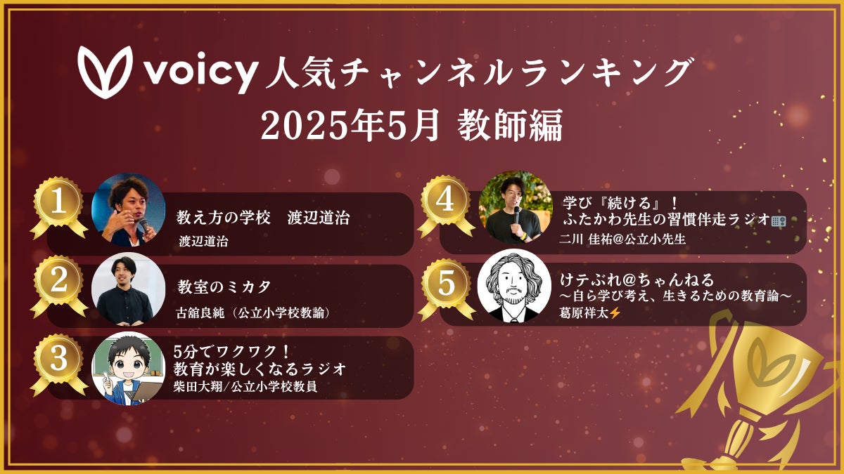 近年、教育現場における課題の多様化や新しい教育手法への関心が高まる中、教師自身の経験や知見を発信する動きが活発になっています。また、他の教師の実践例や専門家の意見を求める声も多く聞かれます。Voicyは、こうした教師や教育に関心のある方々が、音声を通じてリアルな情報や多様な視点に触れられるプラットフォームを提供することで、教育の質の向上に貢献したいと考えています。