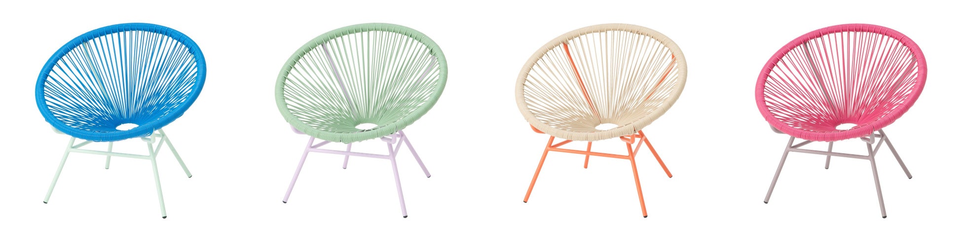 ビビッドな配色がかわいいパーソナルチェアです。ポリエチレンのロープが程よいクッションとなり、見た目よりもやわらかくフィット感のある座り心地が魅力です。お好みのクッションやアートタオル、スローと合わせて快適なリラックスタイムをお過ごしいただけます。アルミニウムのフレームを使用しているので軽く、移動もかんたん。屋外での使用も可能です。