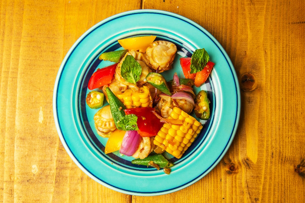 コーンやオクラ、パプリカなど彩り豊かな夏野菜とホタテのスパイスを効かせたマリネ。ビールとの相性抜群です!