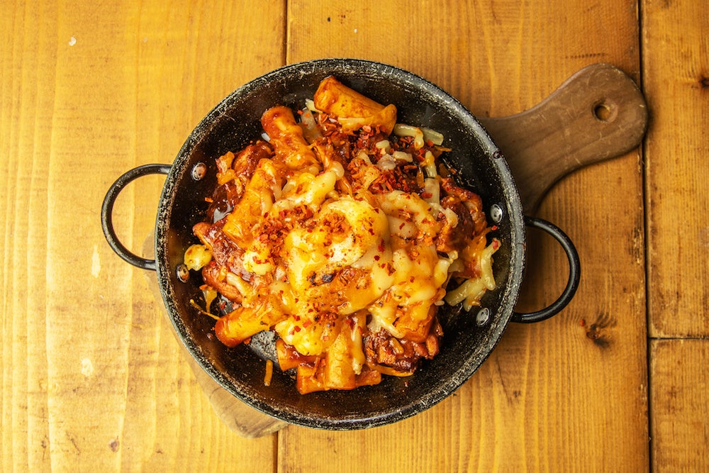 韓国風の甘辛タレをかけたヤンニョムチキンに、もちもち食感のトッポギを合わせて2種類のチーズで焼き上げました。お酒が進みます!