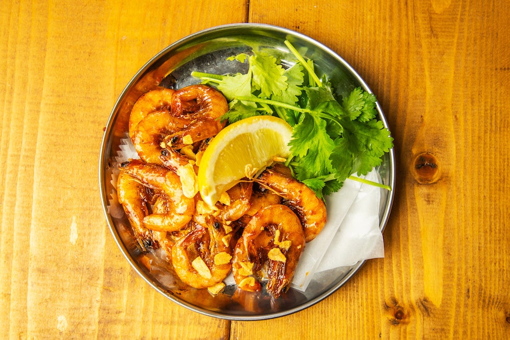 芝えびを使用したひとくちサイズのガーリックシュリンプ。レモンを絞ってさっぱりとお召し上がりください。