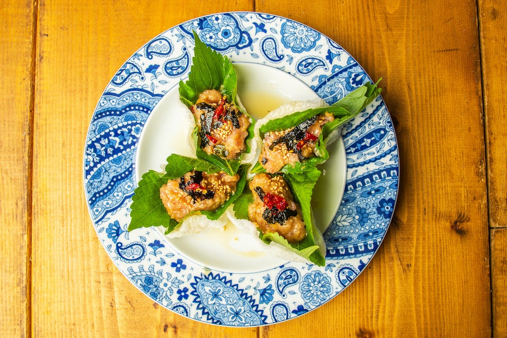 マリネしたネギトロを海老煎餅とエゴマで包みました。独特な香りがクセになる!