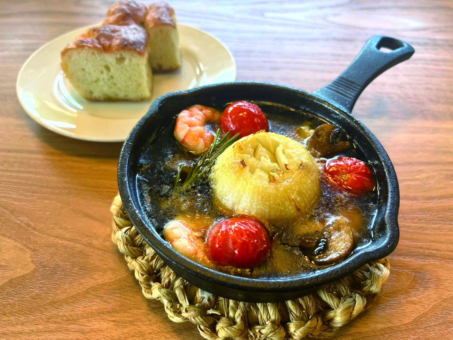 丸ごとニンニクを楽しめるインパクト大のアヒージョ!自家製フォカッチャとの相性抜群!