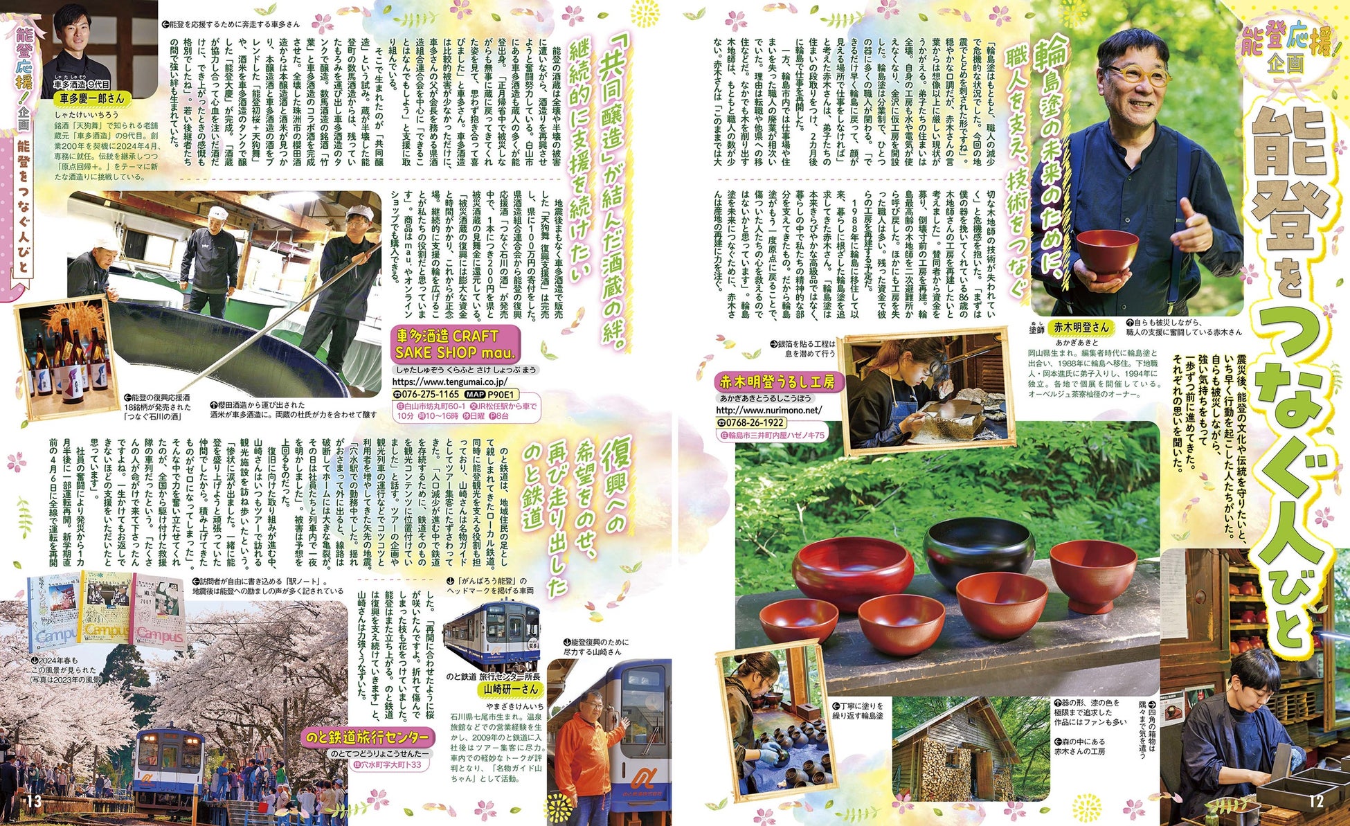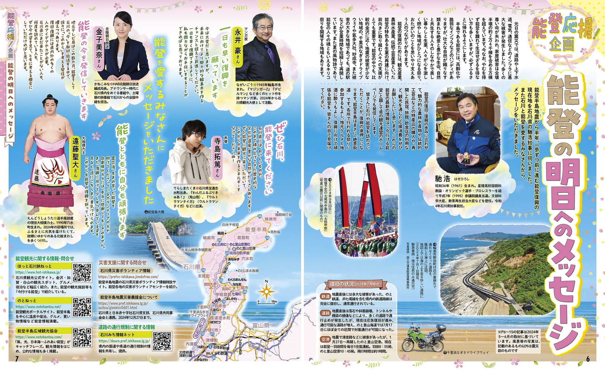 令和6年元日に被災した石川県能登地域。いまだ復興の途上にありますが、そんな中、地元で営業を再開した店舗や施設、能登伝統の文化や技術を未来へ繋ぐため県内外と連携をはじめた職人たち、輪島出張朝市の取り組みなど、復興への歩みは少しずつ、力強く進み始めています。そんな能登エリアの現状を取材し、最新情報(6月取材時点)を10ページにわたって紹介しています。石川県の馳浩知事をはじめ、漫画家の永井豪氏や力士の遠藤聖大氏ら、各方面で活躍する能登ゆかりの方からの応援メッセージも掲載されています。「この状況で現地を訪ねて良いのだろうか」「旅を通して被災地を応援したい」と旅を通した応援を考えている方々に向けて、現時点での復興情報と現地からの力強いメッセージをまとめました。