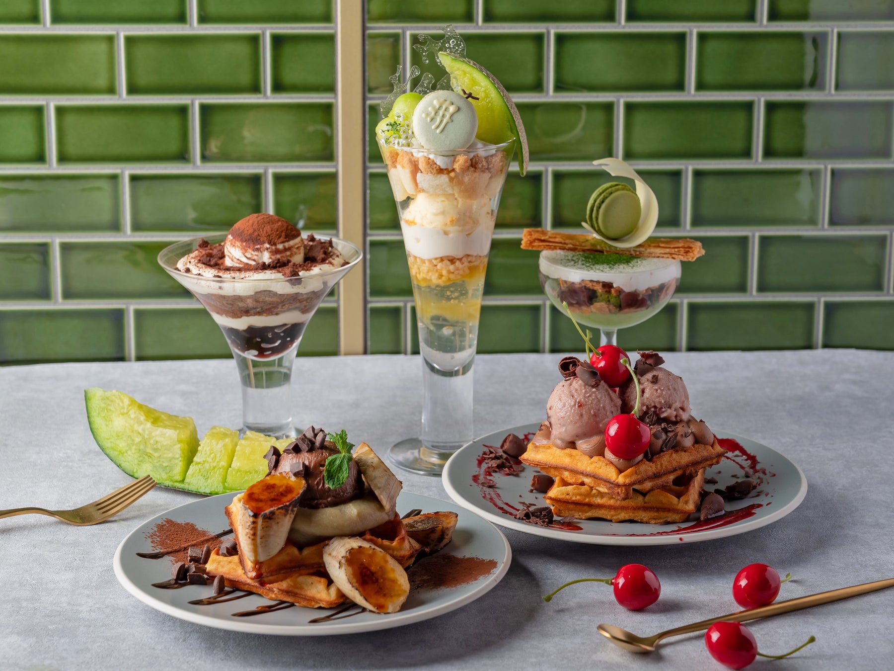 みずみずしい完熟メロンを贅沢に重ねたパフェと、甘酸っぱいチェリー×チョコレートの風味豊かな焼き立てワッフル。ティータイムから夜カフェまで楽しめる、旬を味わう2種の新作スイーツ。