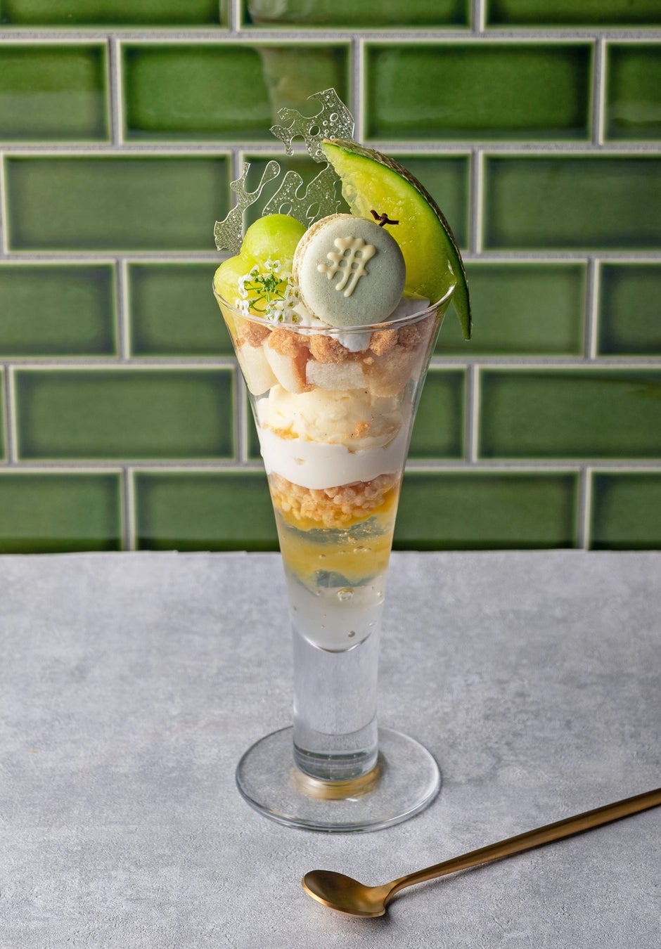 [メロン/飴細工/メロンマカロン/生クリーム/クランブル/スポンジ生地/バニラアイス/アマレットパンナコッタ/ホワイトチョコクランチ/メロンジャム/レモンゼリー]