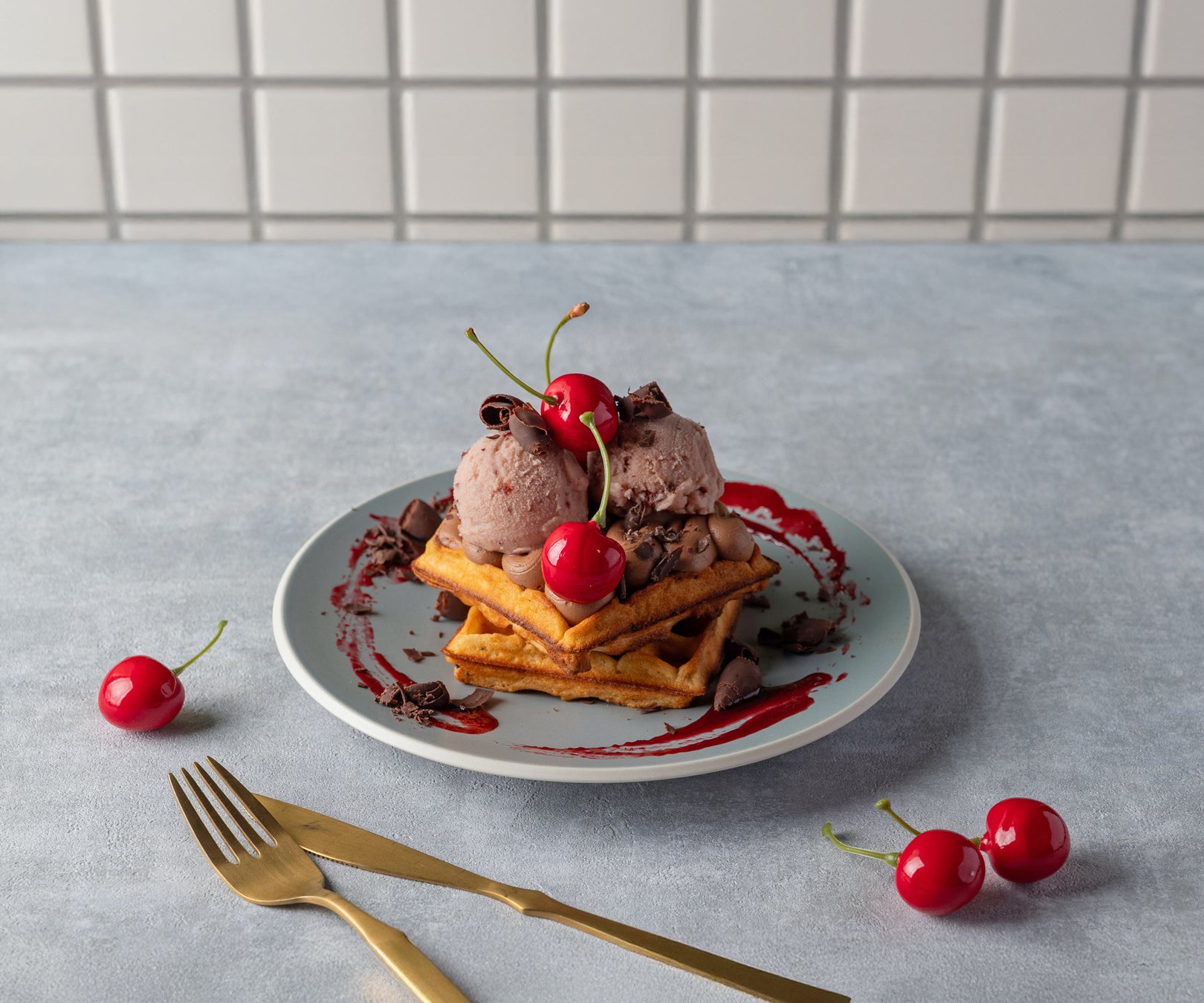 [自家製ワッフル/チョコレートカスタード/ヨーグルトとアマレーナチェリーのジェラート/アメリカンチェリー/コポーチョコ]