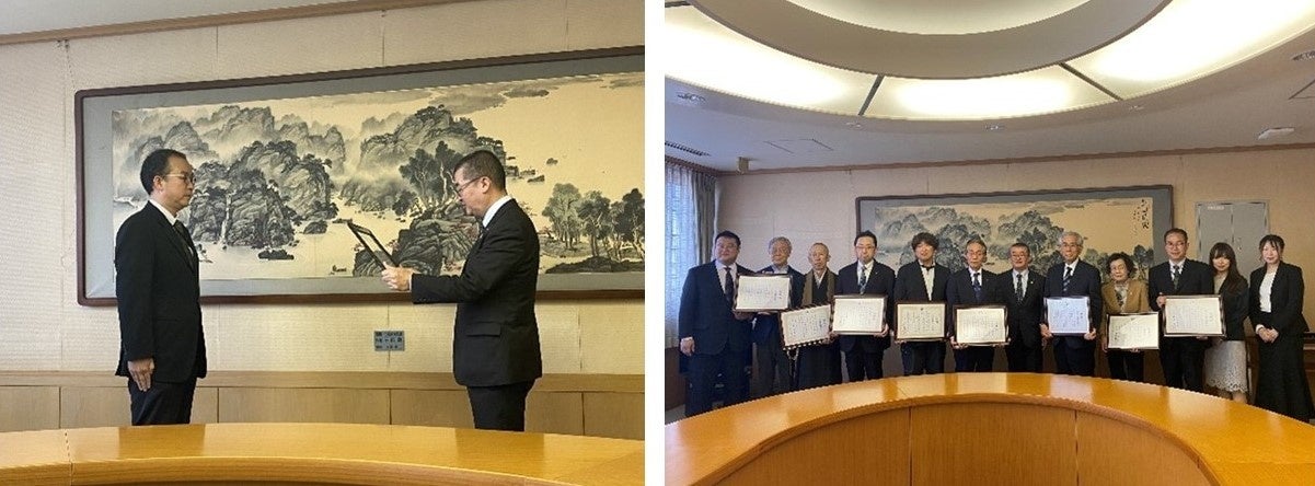 ※社会福祉法人本庄市社会福祉協議会 令和5年度感謝状贈呈式(2023.4.27) (左から)当社総務部部長 石貝、埼玉県本庄市 吉田 信解市長