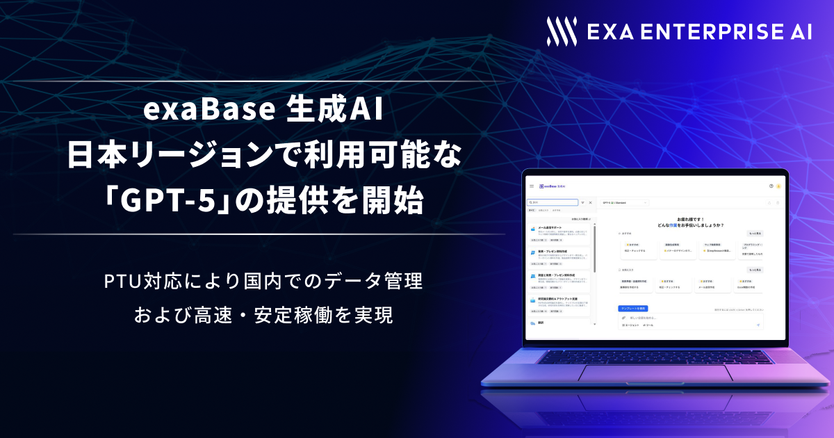 株式会社エクサウィザーズ(東京都港区、代表取締役社⻑ CEO:春田 真、以下エクサウィザーズ)のグループ会社である株式会社Exa Enterprise AI(東京都港区、代表取締役:大植 択真、以下Exa Enterprise AI)は、法人向け生成AIサービス「exaBase 生成AI」において、OpenAIが開発した最新モデル「GPT-5」の日本リージョンでの提供を開始しました。これにより、日本国内で完結できる環境でGPT-5を利用できます。さらに、PTU(Provisioned Throughput Unit)*を活用することで、処理能力を事前に確保し、ピーク時でも高速かつ安定した環境でexaBase 生成AIを利用いただけます。