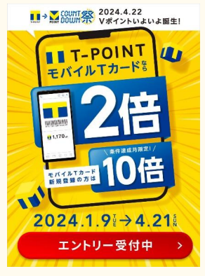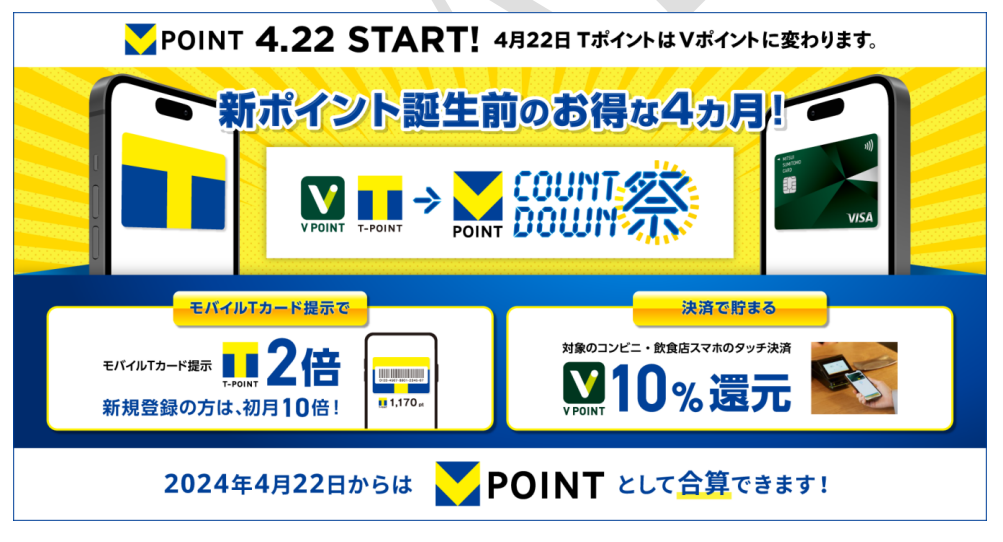 【 4月22日サービス開始「青と黄色の『Vポイント』」誕生記念 】TポイントとVポイントがお得に貯まる4か月「カウントダウン祭」を1月9日より開催!