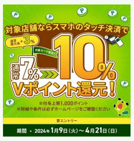 キャンペーンサイトより対象カードでエントリーの上、対象のコンビニ・飲食店にてスマホのタッチ決済をすると、ご利用金額(税込)の10%をVポイントで還元いたします。