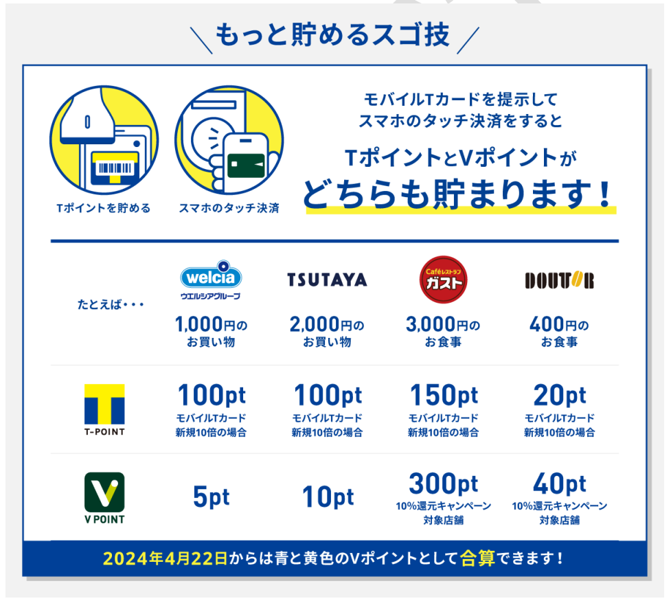 キャンペーン期間中は、ポイント提携先かつクレジットカード加盟店なら、【提示】と【決済】で、さらにお得にポイントが貯まります。例えば、すかいらーくグループの「ガスト」で3,000円分のお会計をすると、モバイルTカードの提示でTポイントが150ポイント(モバイルTカード新規登録で初月10倍が適用される場合)貯まり、さらに三井住友カードのスマホのタッチ決済でVポイントが300ポイント(10%還元キャンペーンが適用される場合)貯まります。ぜひこの機会に【提示】と【決済】を組み合わせて、ポイントがダブルで貯まるお得なお買い物をお楽しみください。