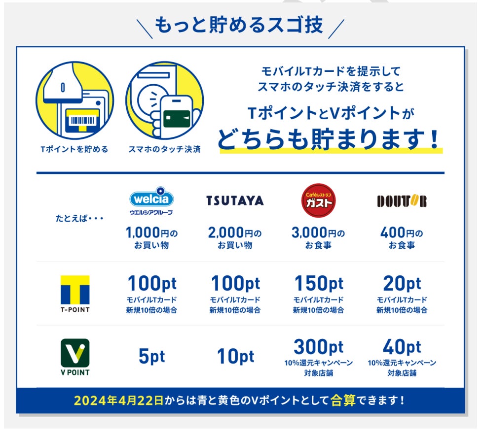 貯まったTポイントとVポイントは、4月22日(月)に「青と黄色の『Vポイント』」へ名称とロゴが変わり、所定の手続きを行うことで合算することができます。本キャンペーンを通じて両ポイントをたくさん貯めていただき、新たなポイントサービス誕生までのカウントダウンをお楽しみください。