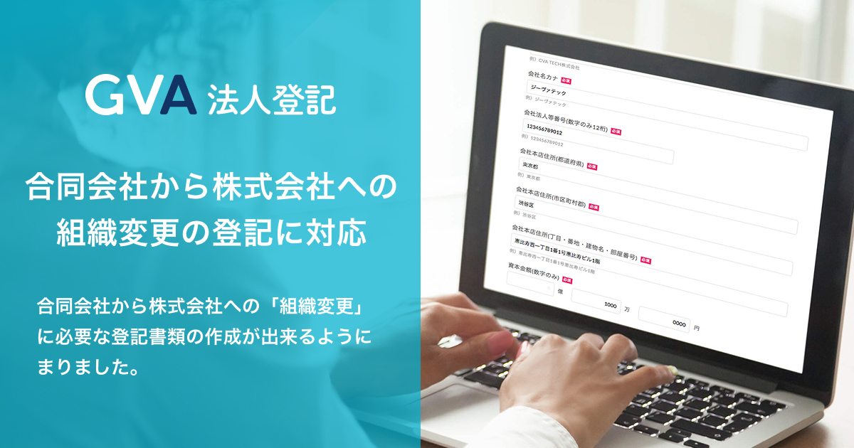リーガルテックサービスの開発・運営を行うGVA TECH株式会社(本社:東京都渋谷区、代表取締役:山本 俊)が運営する「GVA 法人登記」にて、合同会社から株式会社への組織変更の登記書類の作成に対応したことをお知らせいたします。
