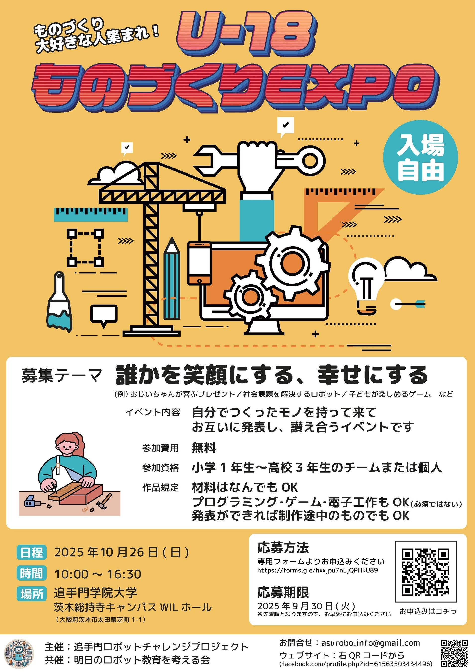 関西圏でものづくりに取り組む小中高生が集まり、自ら作り上げた作品を発表し合うイベント「U-18ものづくりEXPO 2025」が、10月26日(日)に追手門学院大学(大阪府茨木市、学長:真銅正宏)茨木総持寺キャンパスにて開催されます。