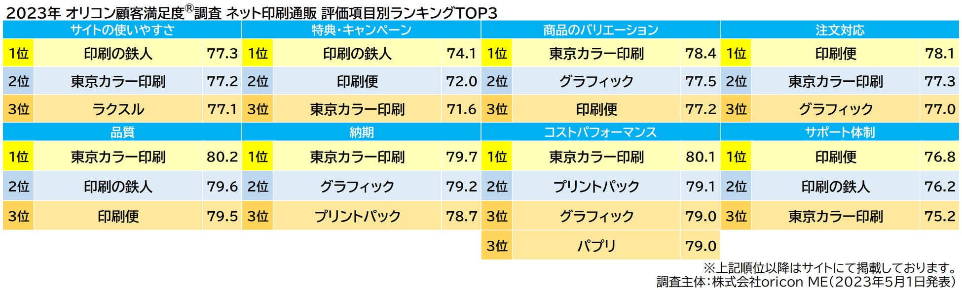 結果は、総合3位の【印刷便】が「チラシ・フライヤー」「名刺」の2部門で1位を獲得しました。