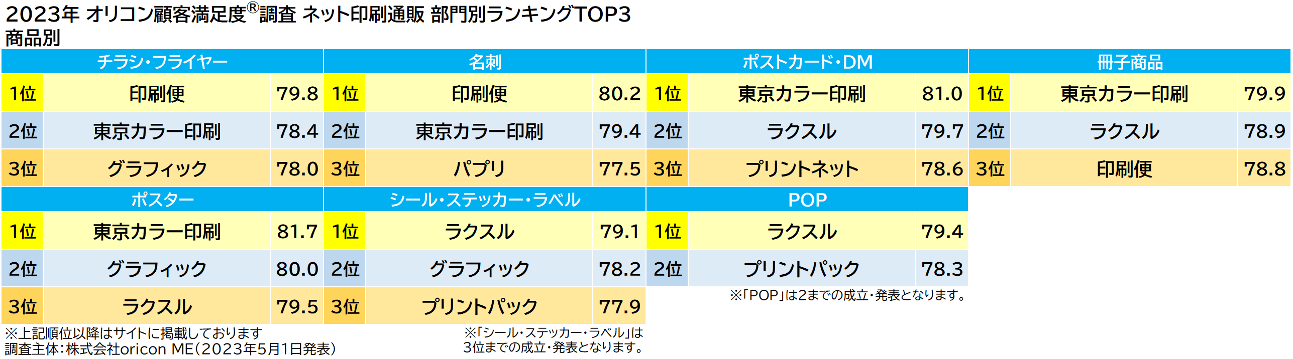 商品別ランキングは、「チラシ・フライヤー」「名刺」「ポストカード・DM」「冊子商品」「ポスター」「シール・ステッカー・ラベル」「POP」の全7部門を発表しました。
