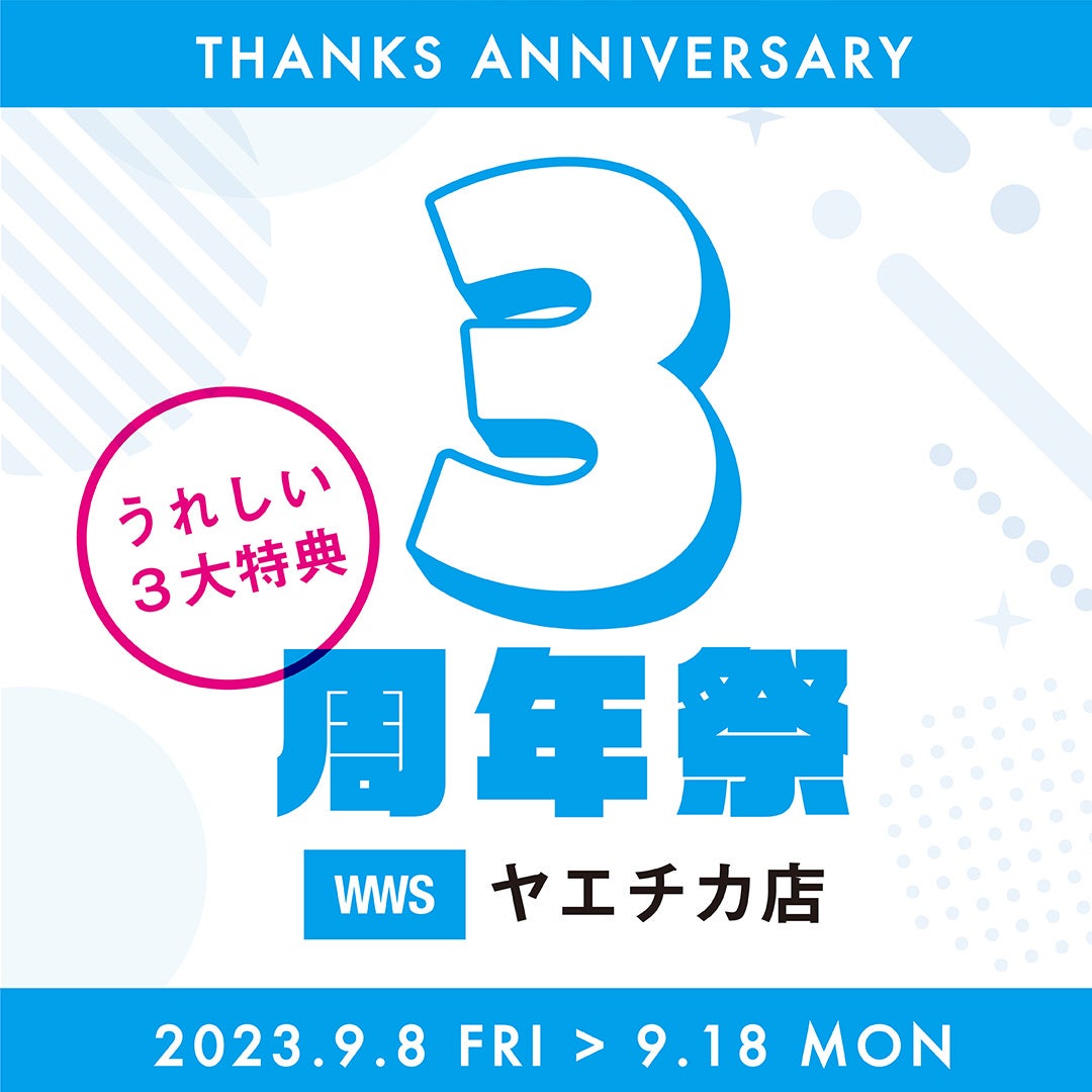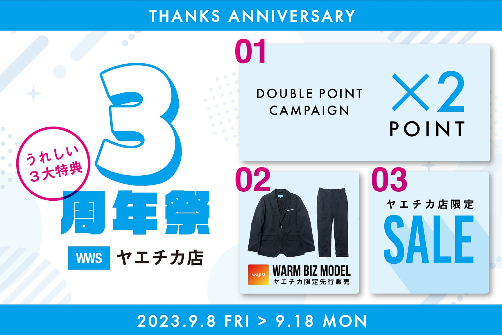 WWSヤエチカ店は、2023年9月でオープン3周年を迎えます。常設直営店1店舗目として2020年9月8日にオープンしてから、数多くのお客様にお越しいただきました。日頃のご愛顧に感謝を込めて、2023年9月8日(金)~2023年9月18日(月)の間、店頭にて「WWSヤエチカ店3周年祭」を開催いたします。ポイント2倍特典や限定セールブースを設置いたします。さらに、秋冬人気商品「ウォームモデル」のセットアップの先行販売を行います。皆様のご来店を心よりお待ち申し上げております。