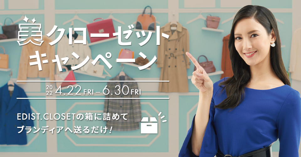 BEENOS株式会社(東証プライム 3328)の連結子会社である、株式会社デファクトスタンダード(本社:東京都大田区、代表取締役社長:仙頭健一、以下「デファクトスタンダード」)が運営する国内最大級の宅配買取サービス「ブランディア」は、株式会社EDIST(本社:東京都渋谷区、代表取締役社長:満薗かおり、以下EDIST)が展開するファッションレンタルサービス『EDIST. CLOSET(エディストクローゼット)』と提携し、2022年4月22日(金)から6月30日(木)まで、「美クローゼットキャンペーン」を実施いたします。