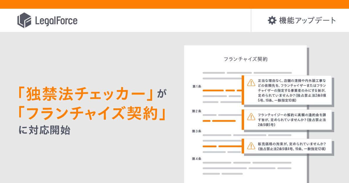 AI契約審査プラットフォーム「LegalForce」、独占禁止法の観点で契約書の注意すべきポイントが把握できる「独禁法チェッカー」がフランチャイズ契約に対応開始
