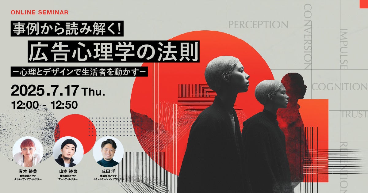 コミュニケーション変革をクリエイティブで実現する株式会社アマナ(本社:東京都品川区、代表取締役社長:金子剛章、以下「アマナ」)は、2025年7月17日(木)、「事例から読み解く!広告心理学の法則 ー心理とデザインで生活者を動かすー」をテーマにウェビナーを開催します。