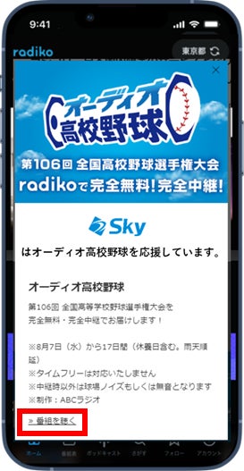 ラジコはMAU(月間アクティブユーザー数)約900万人に利用されている、国内最大級の音声配信プラットフォームです。「オーディオ高校野球」はラジコのプラットフォームからエリアの制限なく、全国どこからでも完全無料で気軽に聴くことができますので、ぜひこの機会にお試しください。なお「オーディオ高校野球」は新しいサービスということもあり、聴き方に関する問い合わせも多く頂いており、下記にてスマートフォンでのおすすめの聴き方をご案内いたします。