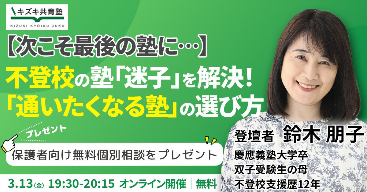 2026年3月13日(金)、不登校のお子さんのための完全個別指導塾「キズキ共育塾」は、無料のオンラインイベントを実施します。