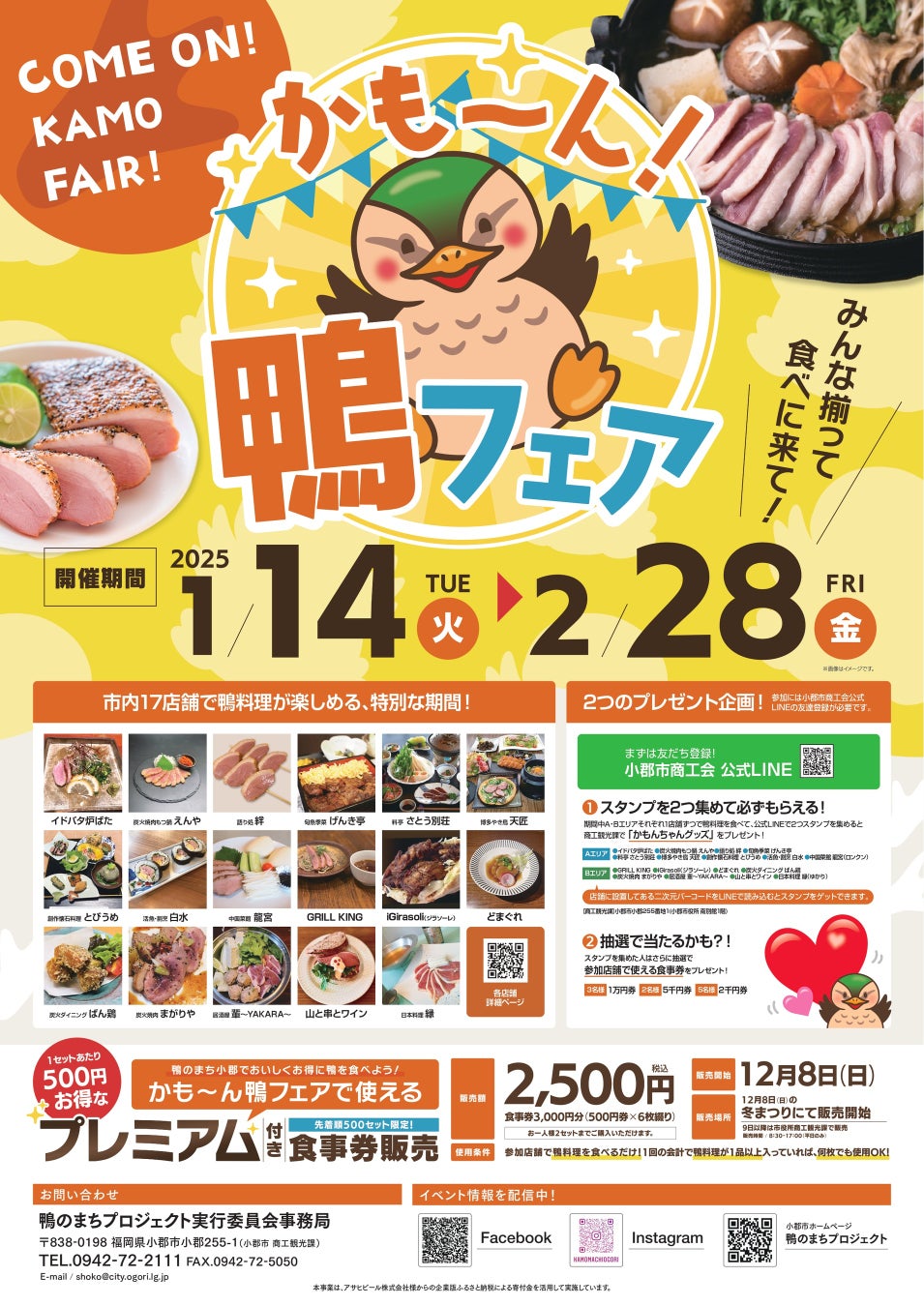 小郡鳥栖南スマートICやコストコ小郡店のオープンで新たな賑わいが生まれている小郡市。そんな小郡市の1月は、名物の鴨(カモ)料理に注目。伝統行事やイルミネーション、いちご狩りなどと組み合わせて、鴨料理イベント「かも~ん!鴨フェア」をぜひ。昼も夜も、小郡市でお楽しみください。