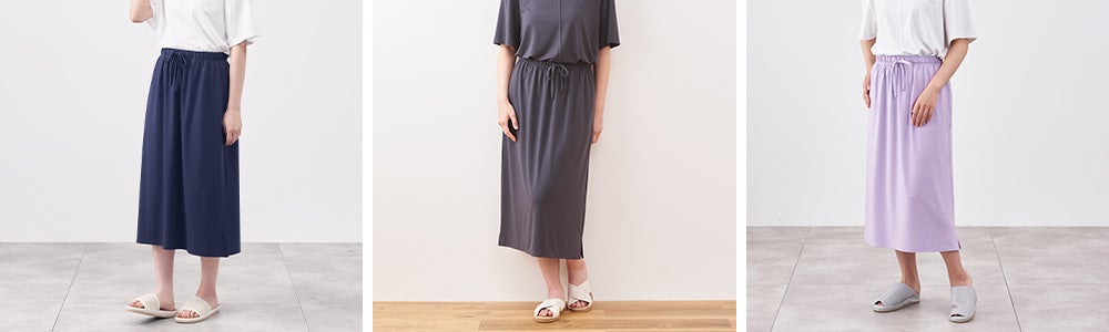 新作ナイトウェアとルームサンダルの販売に続き、今回は「寝るためのナイトウェア」から幅を広げ、家中で過ごす時間を快適にするケユカ リラックスウェアを展開。これまではナイトウェアをセットで販売してきましたが、洗い替え用としての購入や、気分や季節に合わせて上下の組み合わせをお楽しみいただけるよう、単品で販売いたします。 Tシャツ(長袖・半袖)、ワンピース、パンツ(ロング・3/4レングス)、スカート、カーディガンの7種のアイテムを取り揃えています。